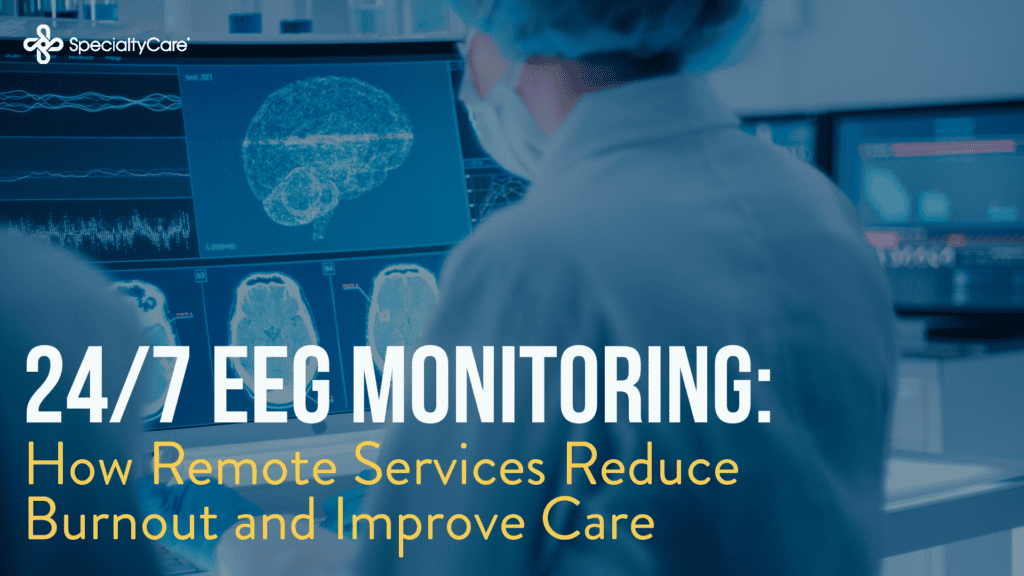 Are you interested in providing continuous EEG monitoring on a remote basis? SpecialtyCare can assist your hospital by supplementing your current EEG services with remote monitoring that will help you reduce burnout among your techs and save necessary resources. Our highly experienced and trained EEG technologists can interpret data in real time, allowing for rapid notifications of adverse events which results in more timely interventions for patients. We want to help you provide the best possible care for your patients and ensure that you can retain critical staff. Our remote EEG monitoring services can support your healthcare system and help you improve patient outcomes. Contact us today to learn more!
