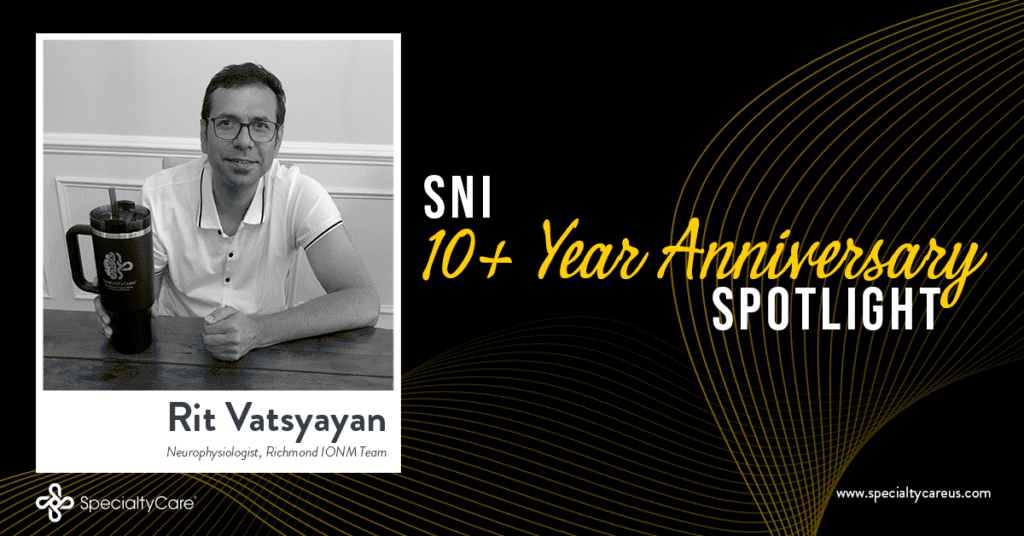 We are thrilled to celebrate Rit Vatsyayan, a Clinical Neurophysiologist on our Richmond IONM Team, who has been with SpecialtyCare for over ten years. After earning his Ph.D. in Biochemistry, Rit was drawn to surgical neurophysiology by its unique blend of neuroscience, technology, and patient care, captivated by the ability to monitor and protect the nervous system during surgery. His dedication has allowed him to directly impact patient outcomes, preventing neurological damage in critical situations.